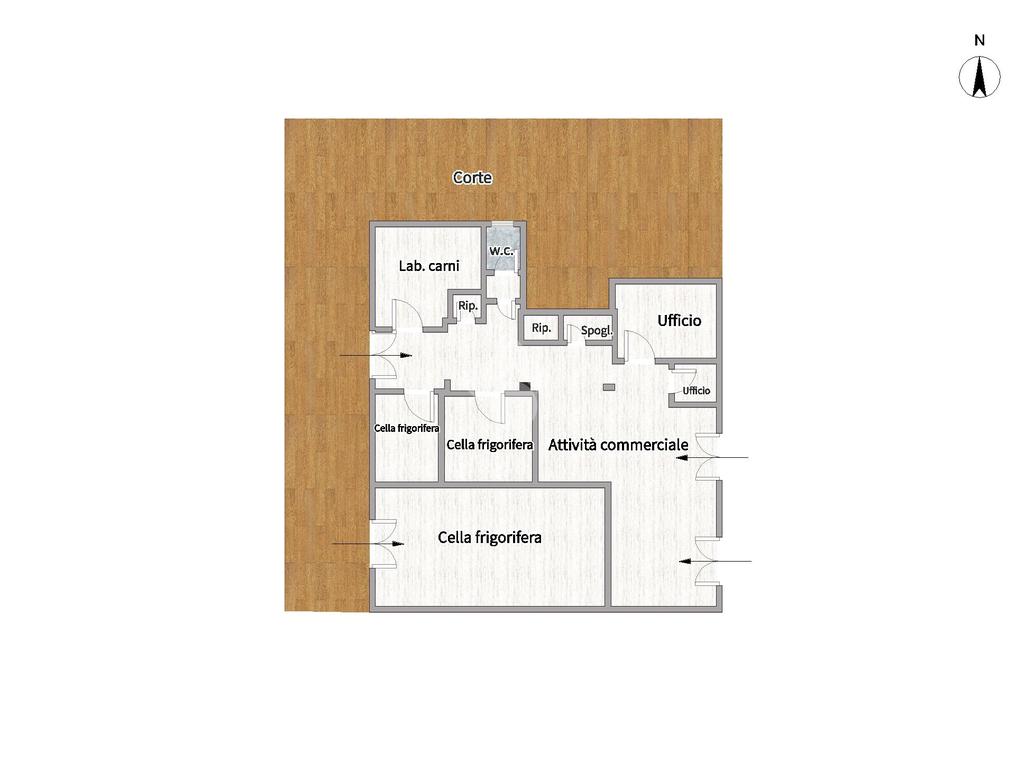L'immobile costruito nel 1989, è attualmente locato, garantendo un immediato ritorno sull'investimento per il futuro compratore. Esso offre una vasta area interna attualmente divisa in: attività commerciale, tre celle frigorifere, due locali adibiti ad ufficio, due riposti, spogliatoio, anti e locale per la lavorazione delle carni. Dispone inoltre di una ampia corte esterna ideale per carico/scarico merci e posteggio per mezzi.